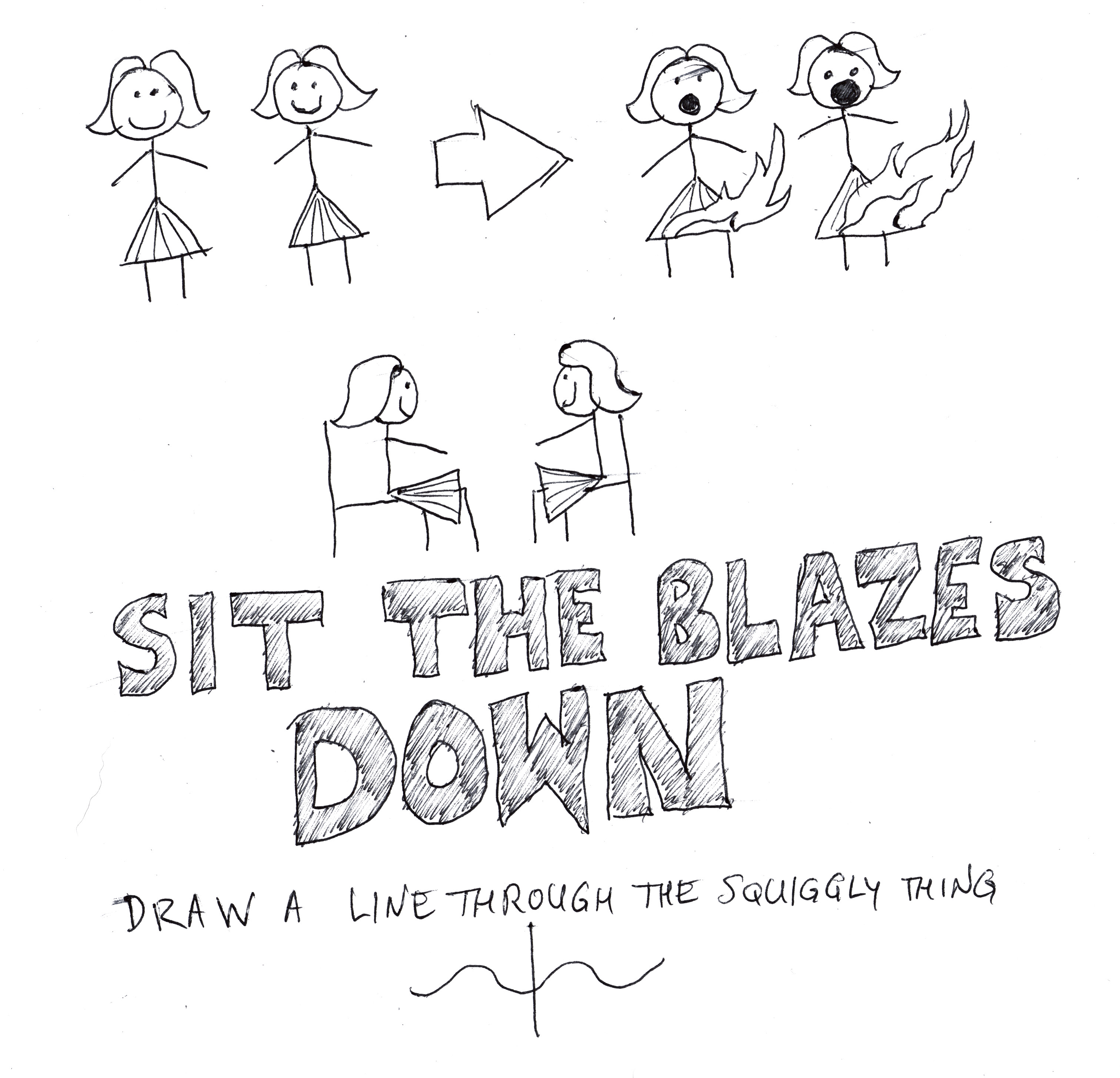 Grade school students of Fork in the Road Private Academy, currently closed due to the scabies outbreak, took to the sidewalks around town to echo Dr. Greewichuk's advice, writing "Sit the blazes down!" everywhere in chalk.